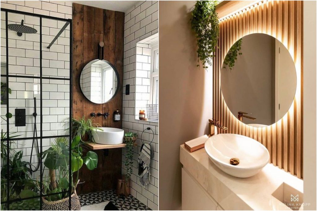 If you love a space that feels both cozy and edgy, this trend is your perfect match. Focus on a palette of natural wood and matte black finishes to ground the room. A leaning ladder mirror is a standout “pro-tip” for this style, offering a chic way to display towels while saving precious floor space. To complete the vibe, opt for hexagonal tiles in muted, earthy tones—they provide a much more textured and unique feel than standard white tiles.