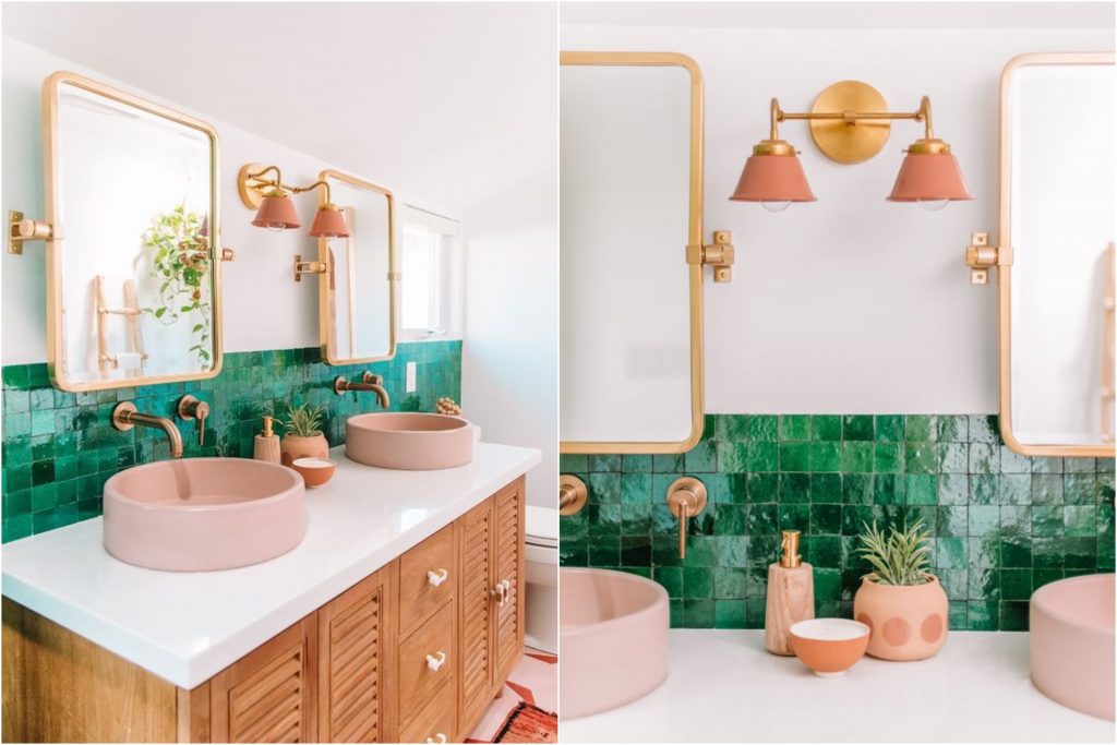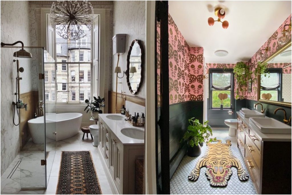 While the urge to maintain a perfectly “matchy-matchy” aesthetic is strong, the most memorable bathrooms of 2025 embrace a more daring, curated approach. Channel your inner designer by experimenting with a high-contrast blend of materials and eras. Consider the juxtaposition of a lavish, traditional chandelier against bold, funky geometric tiles. When paired with a statement-making angled tub, these contrasting elements create a space that feels uniquely bespoke rather than “out of the box.”